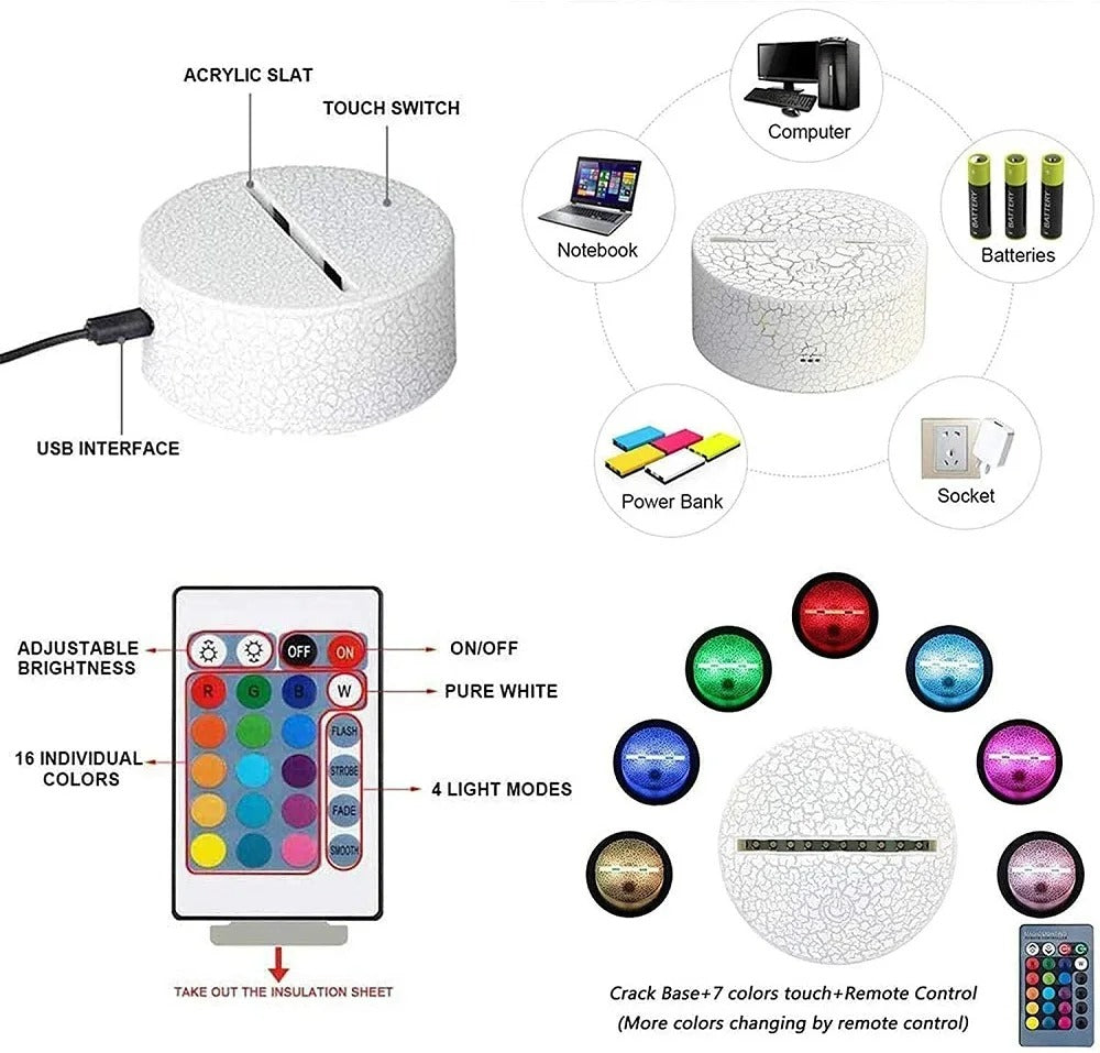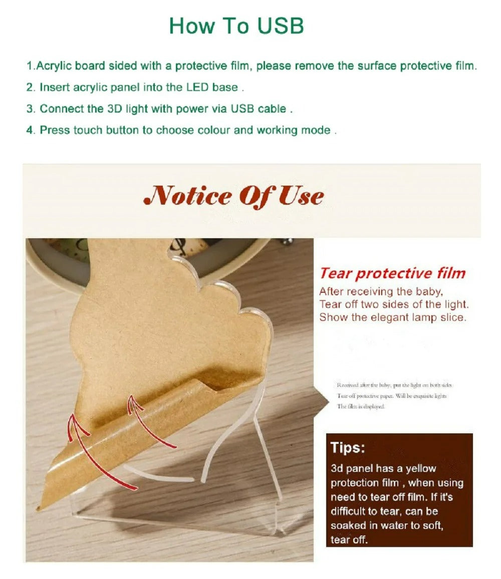 Advantages: The size of acrylic board and lamp holder is 90% larger than other 3D lamps. The circuit board is of high quality. The details and 3D pattern design have been optimized. The LED light is soft and uniform, no glare, no flicker, dimmable, and harmless to children's eyes.